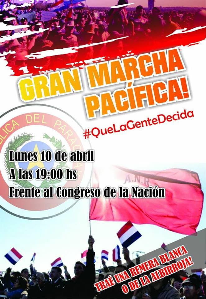 Pedro Alliana, presidente del Partido Colorado, insta a sus seguidores a ser parte de esta manifestación, que ya ha recibido críticas por parte de sus detractores y la aceptación de sus correligionarios, pese a que desde el mismo gobierno el llamado a manifestaciones era considerado como una incitación a la violencia.