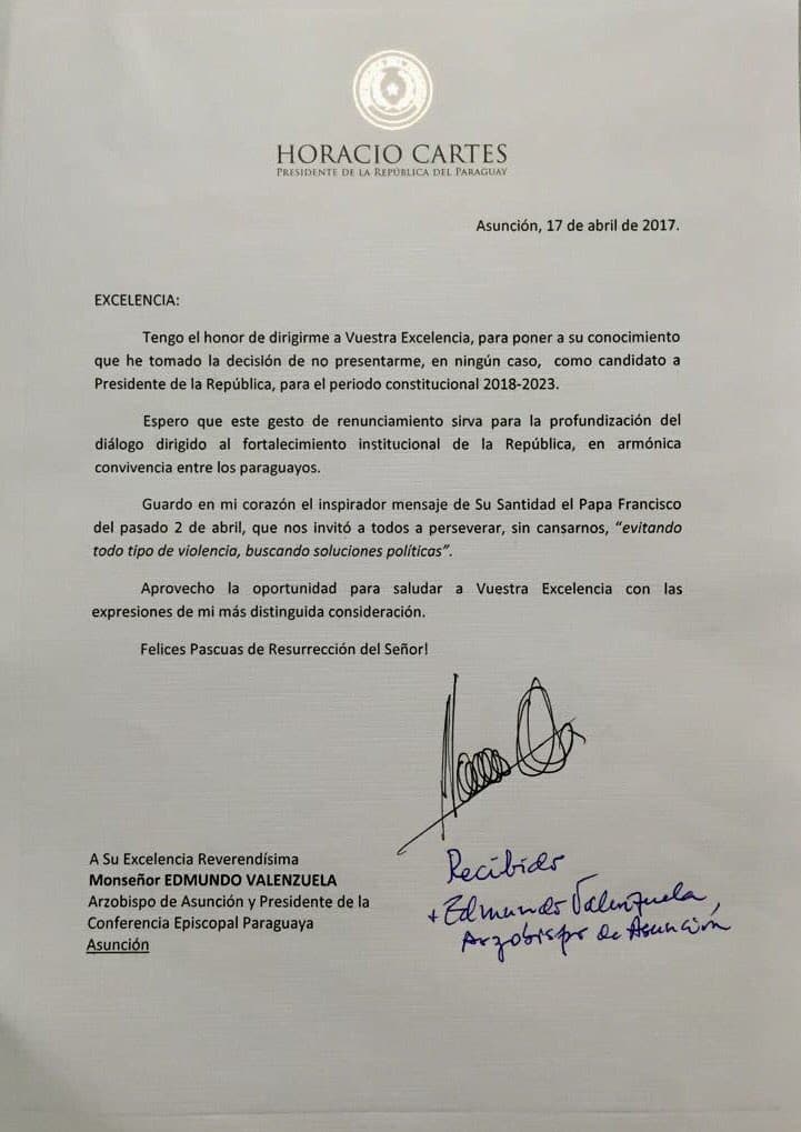 Sorpresivamente, el presidente paraguayo publicó a través de su perfil en Twitter una carta dirigida al Arzobispo de Asunción y presidente de la Conferencia Episcopal Paraguaya, Monseñor Edmundo Valenzuela; y en la que anuncia el renunciamiento a su candidatura en 2018.