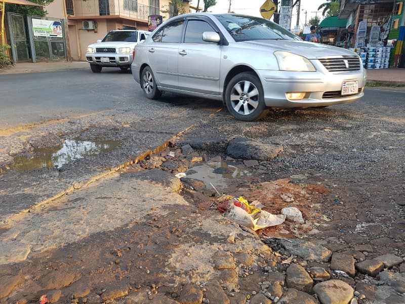 Otro de los puntos críticos se localiza, Sobre la avenida Mcal. López frente a la ciclovía donde los baches no perdonan a ningún vehículo.