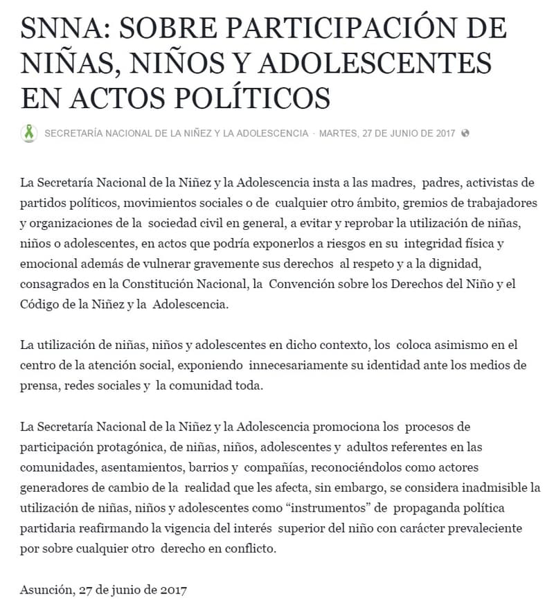 La Secretaría de la Niñez y la Adolescencia considera estos actos como inadmisibles e insta a los padres de los niños, niñas y adolescentes que eviten exponer a sus hijos en actos proselitistas o de cualquier otra índole que puedan afectar su integridad física y emocional.