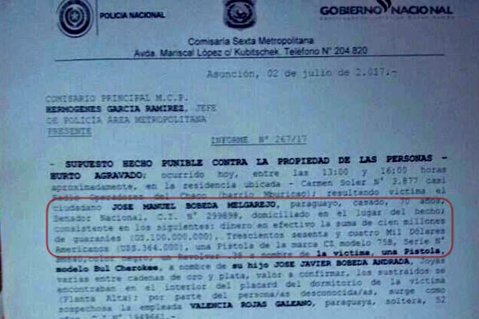 Se presume que el monto robado fue de G. 100 millones y US$ 364.000, lo que rondaría los G. 2.135 millones que tenía en su domicilio.
