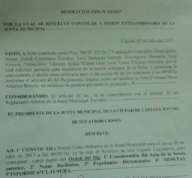 El presidente de la Junta Municipal, Javier Trinidad Salinas mediante una resolución otorgó permiso de abandonar la sesión a los concejales capiateños para ir hasta Mburuvicha Róga con el fin de saludar a Cartes.