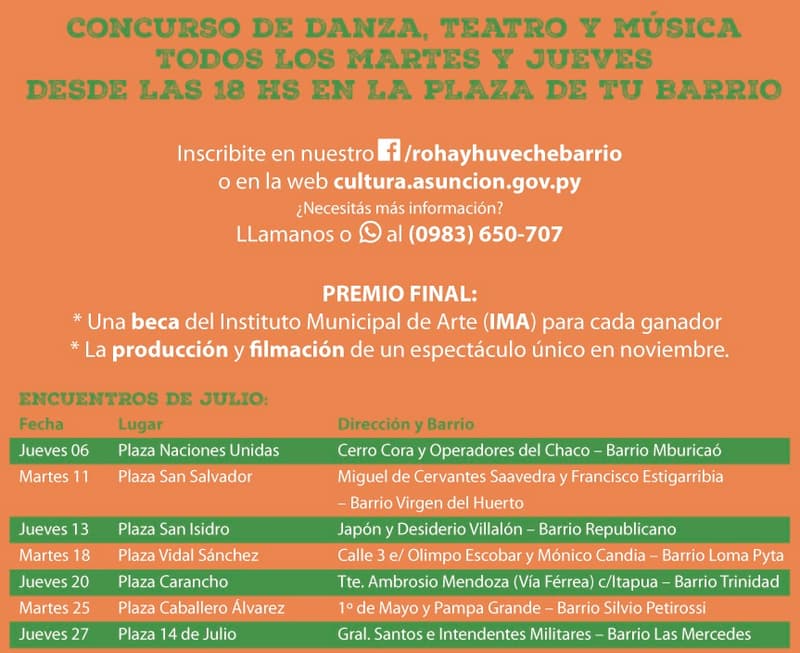 Los interesados podrán inscribirse completando sus datos en facebook.com/RohayhuveCheBarrio o (@RohayhuveCheBarrio). O también a través de cultura.asuncion.gov.py/.