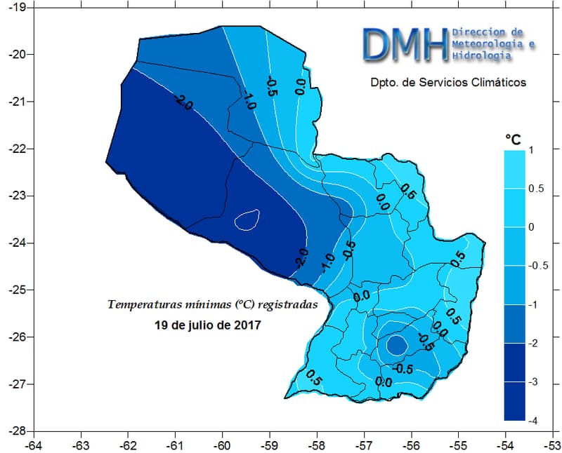 Temperaturas mínimas muy bajas nuevamente se han registrado el día de hoy 19 de julio en gran parte del país, sin embargo, el día de ayer 18 de julio se mantiene como el día mas frío en lo que va del año 2017. Las marcas térmicas oscilaron entre -3 ºC a 1.2 ºC a lo largo del país, los valores más bajos se registraron en la zona del Chaco, la mínima más baja se dio en la estación de Pozo Colorado con -3 ºC, superando con este valor su registro histórico diario mensual (-2.6 ºC). Las estaciones de Mcal. Estigarribia y Gral. Bruguez, ambos registraron valores de -2.6 ºC sobrepasando también sus records históricos diarios mensuales de -1 ºC y 0.8 ºC respectivamente. Por otro lado, en la Región Oriental, se registraron nuevamente valores inferiores a 0 ºC, con Temperaturas mínimas que fluctuaron entre los -1.5 ºC y 1 ºC. La estación de Concepción registró -1.5 ºC y superó su mínima diaria mensual histórica de -0.8 ºC, siedo éste el registro más bajo en la Región Oriental. En la estación meteorológica del Aeropuerto Silvio Pettirossi, en el departamento Central, se registró una mínima de -0.1 ºC, valor que rompe el record diario histórico para el mes de 0.8ºC. En el departamentos de Caazapá la mínima fue de -1.4 ºC, superando así su valor mínimo histórico diario mensual (0ºC). Según los pronósticos generados por el Departamento de Análisis y Predicción del Tiempo de la DMH, se espera un paulatino ascenso de la temperatura para los próximos días.