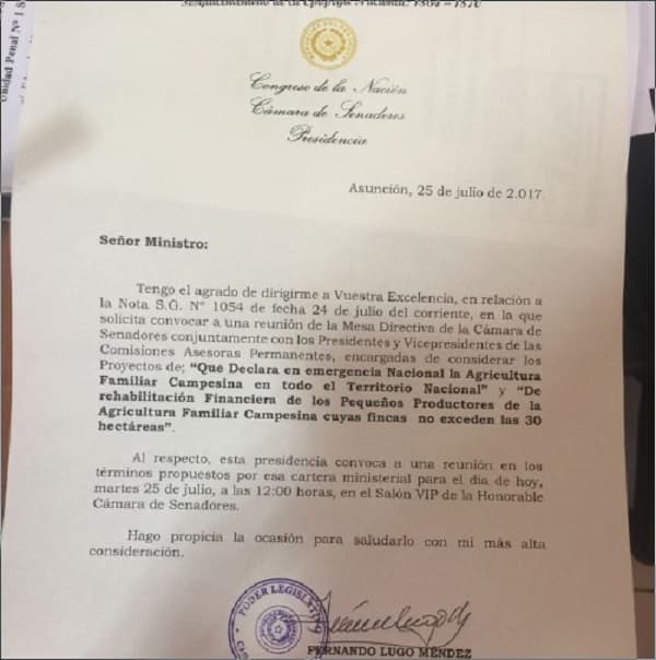 Fernando Lugo, presidente del Congreso, convoca a un diálogo con la Mesa Directiva y líderes de bancadas del Senado, para tratar el proyecto solicitado por los labriegos.
