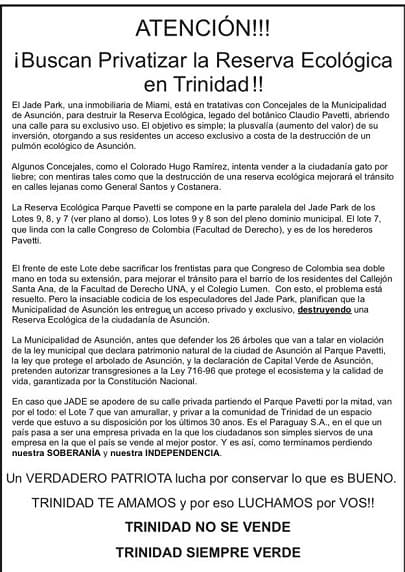 Según los defensores del Parque Pavetti, el Jade Park, viola varias normas ambientales, por tema de desagüe cloacal, la municipalidad no protege al Acuífero Guaraní que pasa por debajo del sitio y mucho más.