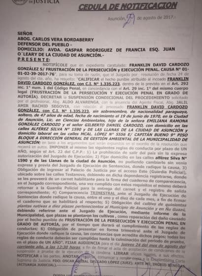 “Los delitos ecológicos previstos en la Ley 716 y en el Código Penal cuya persecución fuese frustrada por el mencionado director de Medio Ambiente sean investigados, hasta llegar a los responsables en la Secretaría del Ambiente (SEAM) y la Junta Municipal de Asunción”, remarcó, según informó Abc.