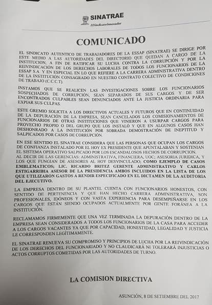 Varias personas estarían implicadas según Víctor Ocampos, del Sindicato Autentico de Trabajadores de la Essap, (Sinatrae). El mismo manifestó a RDN, que con la salida del arquitecto Sarubbi, aún no termina la historia.