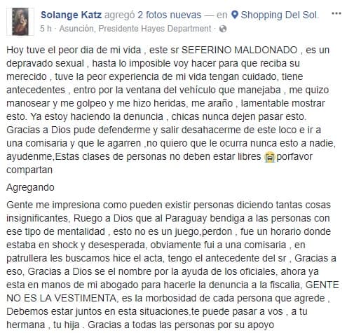 Una usuaria identificada como Solange Katz denunció a través de Facebook que fue víctima de un hombre que la quiso “manosear”.
