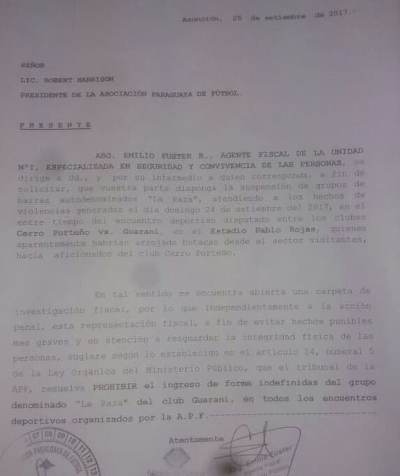 En relación al tema el fiscal solicitó al presidente de la Asociación Paraguaya de Fútbol, Robert Harrison, que la APF suspenda a la hinchada albinegra por las destrucciones en el estadio.