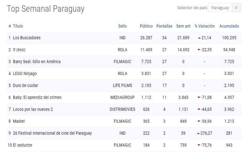 La película paraguaya se mantiene en primer lugar como la cinta más vista, por encima de IT, propuesta de terror que tuvo un estreno muy fuerte, reporta EPA, con base en los datos de la web especializada Ultracine.
