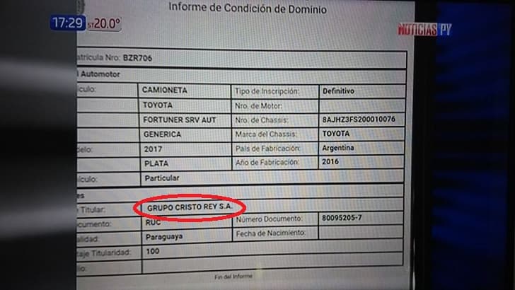 La firma propietaria del rodado está vinculada al presunto narcotraficante Clemencio “Gringo” González. Se trata del Grupo Cristo Rey S.A, según se supo a través del informe de Noticias Paraguay.
