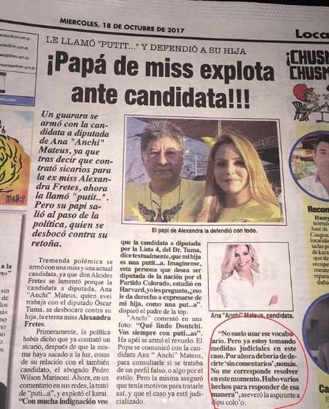 El pasado 18 de octubre, la edición impresa del diario Popular, propiedad del Grupo Cartes, consignó en su tapa que Mateus contrató sicarios y llamó de “put…a” a una mujer, mediática por haber mantenido una relación con el exmarido de la diputada Cynthia Tarragó, el abogado Pedro Wilson Marinoni.