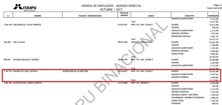 Natasha Zacarías McLeod es la hija del gobernador Justo Zacarías. La mujer ingresó en la función de “asesor especial de director” y percibió en su primer mes de labores la suma de G. 33.115.046.