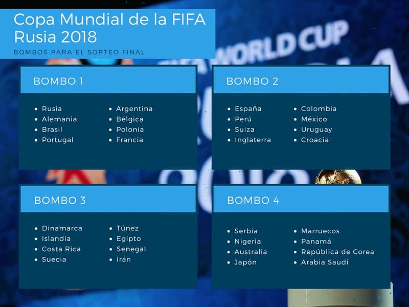 En setiembre pasado, la Comisión organizadora de competiciones de la FIFA confirmó que las 32 selecciones se dividirán en cuatro bombos (8 países en cada uno), según los principios deportivos.