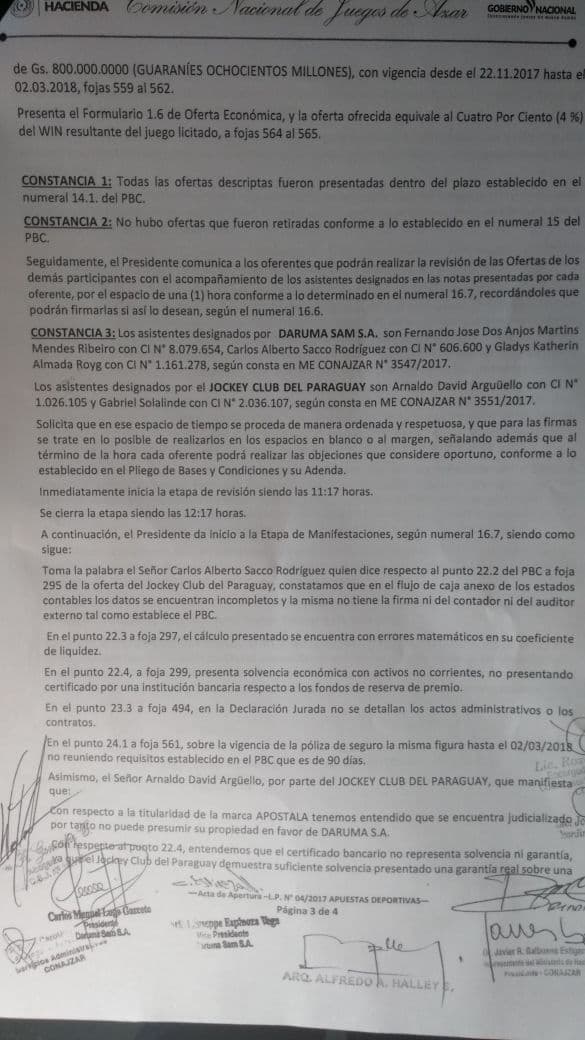 Por otro lado, consta en el acta que el representante de Daruma, Carlos Alberto Sacco, hizo alusión a errores en los documentos presentados por el Jockey.