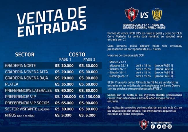 Las que aún quedan por vender son, Gradería Novena, baja que cuenta con un costo de G. 30 mil; Platea G. 60 mil y Preferencias vip G. 130 mil.