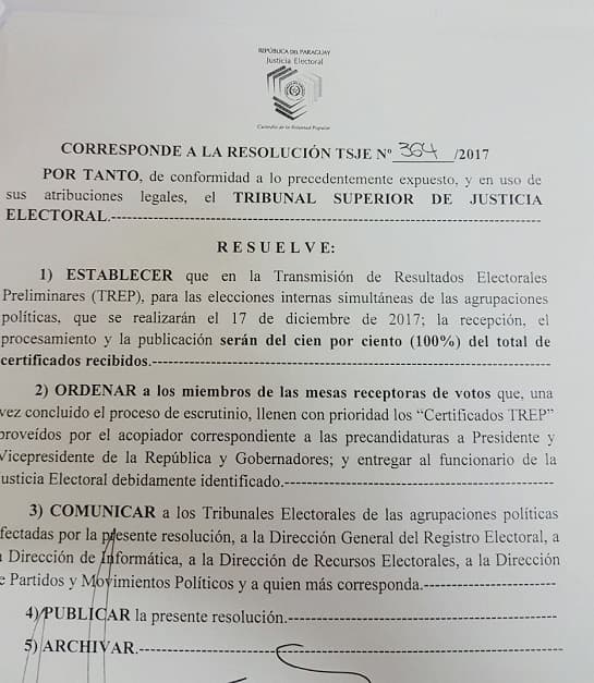 El documento, firmado por los Ministros del TSJE, Jaime Bestard, Alberto Ramírez Zambonini y María Elena Wapenka, establece además a los miembros de las Mesas Receptoras de Voto que una vez concluido el proceso de escrutinio, los Certificados TREP sean completados con prioridad para las precandidaturas a Presidente, Vicepresidente de la República y Gobernadores, para el proceso de transmisión de resultados preliminares.