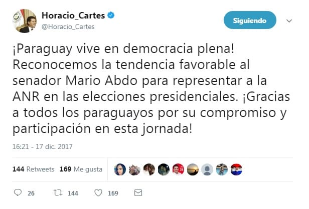 Con un mensaje en Twitter, y sin mucha convicción en el escrito, el Presidente de la República Horacio Cartes, saludó al vencedor en las elecciones del Partido Colorado, Mario Abdo Benítez.