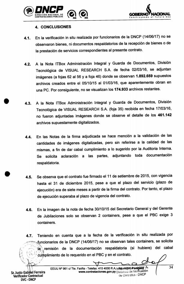 Según un documento de la Dirección Nacional de Contrataciones Públicas (DNCP) señala lo siguiente: “En la verificación in situ realizada por funcionarios de la DNCP (16/06/17) no se observaron bienes, ni documentos respaldatorios de la recepción de bienes o de prestación de servicios correspondientes al presente contrato”.