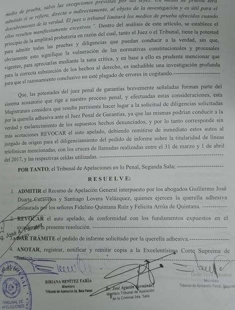 “Mediante dicha decisión se permitirá conocer los detalles del cruce de llamadas entre Horacio Cartes, José Ortiz y otros altos funcionarios de la Policía a modo de que sean incluidos en la investigación llevada a cabo por la Fiscalía”, explicó Duarte Cacavelos.