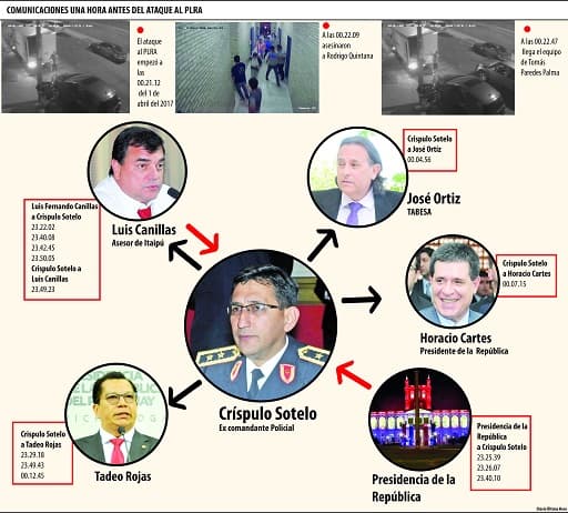 Mediante publicaciones periodísticas, los cruces de llamadas detallaron las oscuras conexiones entre los referentes del Ejecutivo, la Policía, gerentes del Grupo Cartes y liberales llanistas en el caso de la quema de parte de la sede del Senado y el ataque a la sede partidaria del PLRA, donde perdió la vida el joven Rodrigo Quintana, asesinado por la Policía.