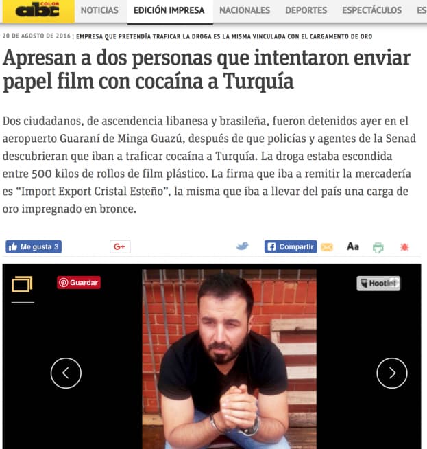Agosto de 2016. Un hombre de ascendencia libanesa es detenido en el Aeropuerto Guaraní, de Ciudad del Este -en la zona conocida como la Triple Frontera entre Paraguay, Brasil y Argentina-, mientras intentaba enviar 39 kilos de cocaína escondidos en rollos de papel film. El destino final de la carga era Turquía.