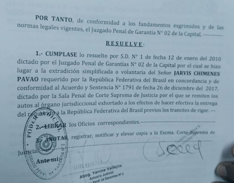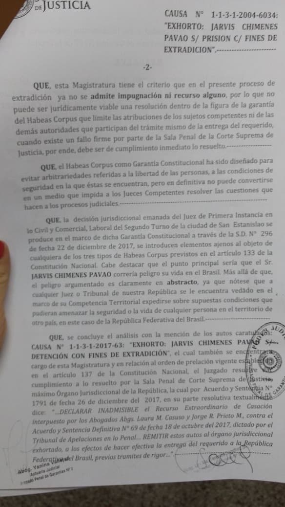 La jueza Lici Sánchez ratificó la extradición de Chimenes Pavão. En su resolución asegura que el habeas corpus obtenido por el procesado no puede impedir el traslado.