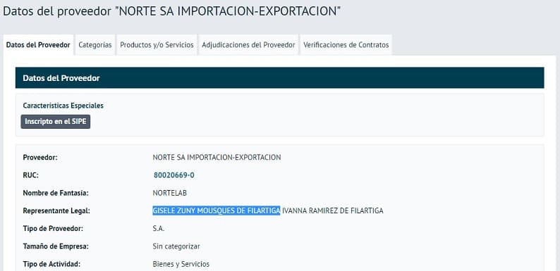 Durante este Gobierno y en solo tres contratos, Gisele Zuny Mousques de Filártiga y su hija Ivanna Ramírez Mousques de Filártiga, también nuera del asesor cartista Darío Filártiga, amasaron la suma de G. 12.289.001.100, a través de la firma Norte S.A de Importación y Exportación.