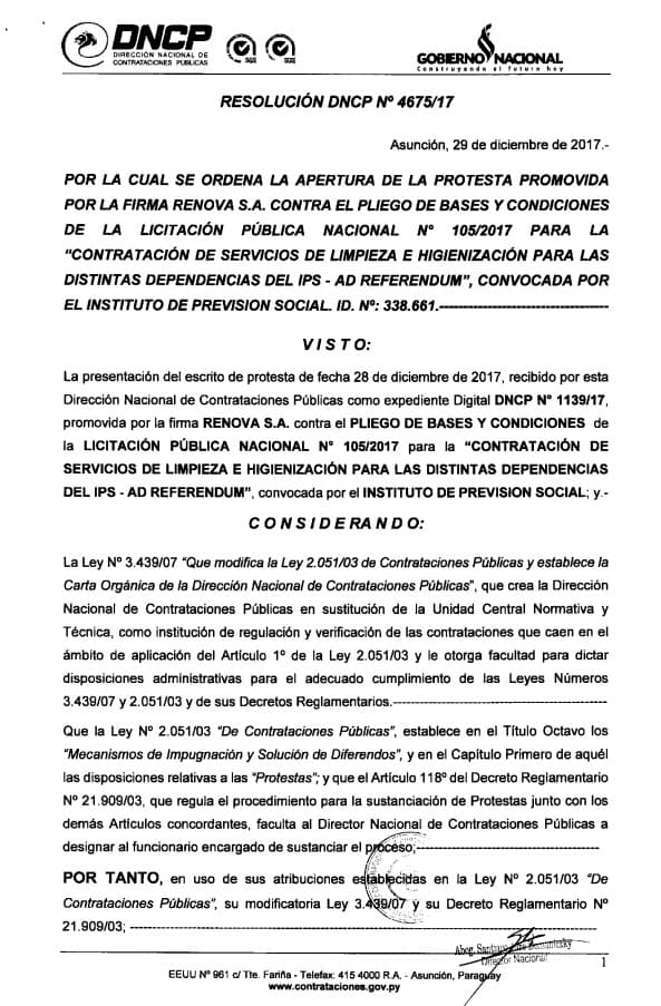 RDN consultó tanto con el IPS como con la DNCP y en ambos entes afirmaron que el proceso se lleva adelante conforme a los reglamentos, y que a pesar de la apertura de ofertas, el reclamo puede ser atendido posteriormente.
