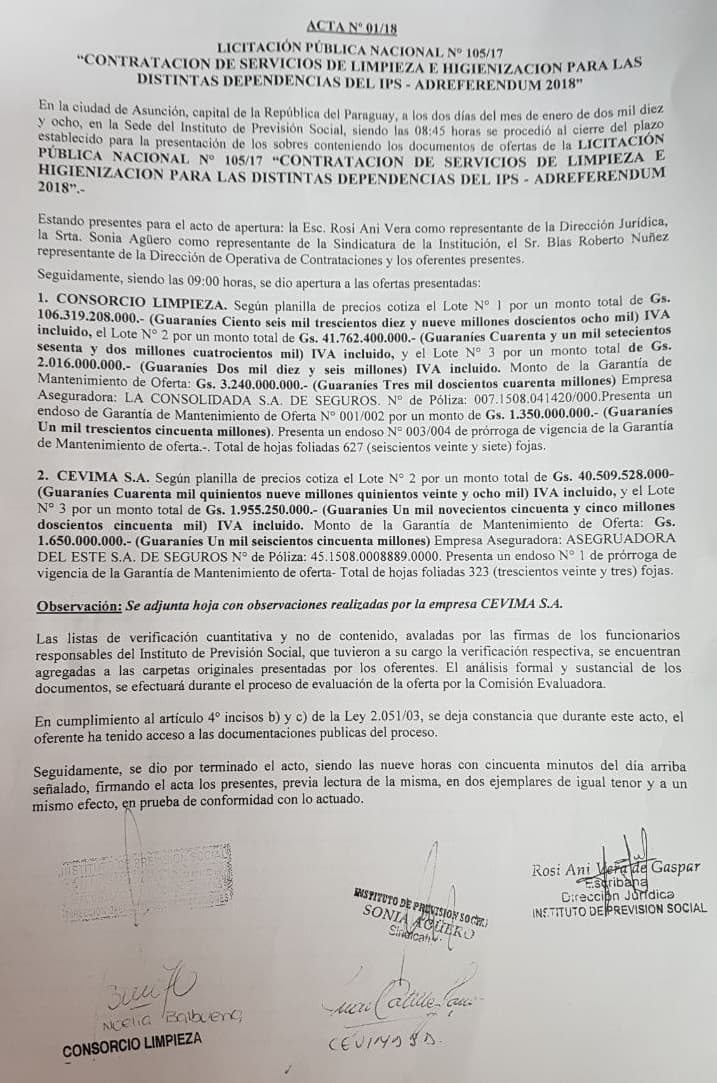 El primer lote es el más “jugoso” ya que supera los G. 100 mil millones, en el caso de Consorcio Limpieza, presentó una oferta por G. 106.319.208.000.