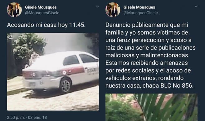“Denuncio públicamente que mi familia y yo somos víctimas de una feroz persecución y acoso a raíz de una serie de publicaciones maliciosas y malintencionadas. Estamos recibiendo amenazas por redes sociales y el acoso de vehículos extraños, rondando nuestra casa, chapa BLC No 856”, fue lo que publicó a en un tuit.