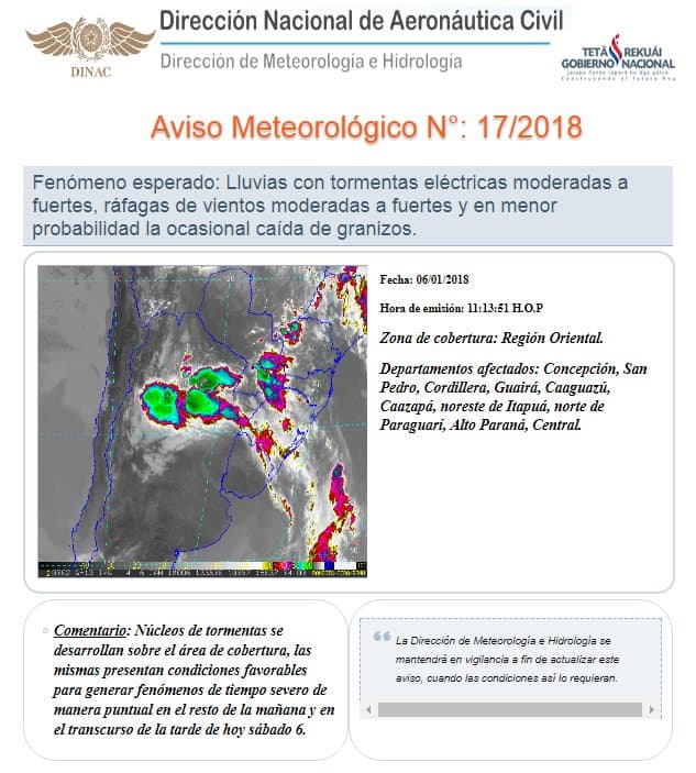 Según informan desde la Dirección de Meteorología, los núcleos de tormentas se desarrollan sobre el área de cobertura y presentan condiciones favorables para generar fenómenos de tiempo severo de manera puntual en el resto de la mañana y en el transcurso de la tarde de este sábado.