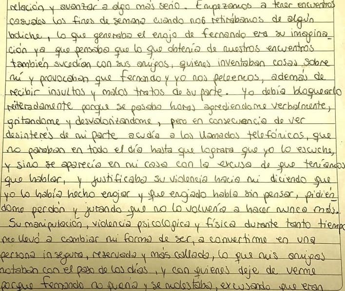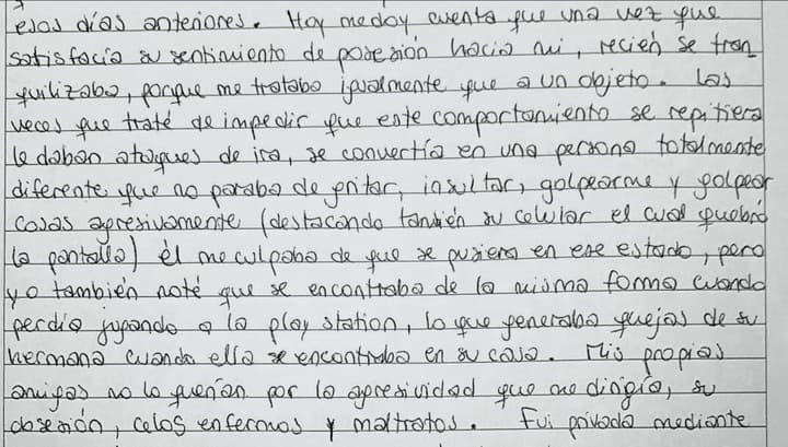 En otro apartado menciono: "Una vez que satisfacía su sentimiento de posesión hacia mí, recién se tranquilizaba porque me trataba igualmente que a un objeto".