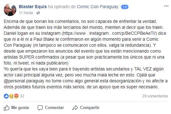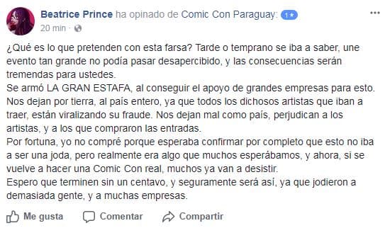 Por su parte, la cosplayer Irina Meier manifestó que finalmente no vendrá a Paraguay para el evento. Argumentó que la publicación de Logan la motivó a cancelar su viaje luego de tener varios problemas con la organización.