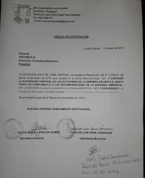 Los pobladores del lugar que se encuentran afectados por la situación solicitaron a través de una nota a la Municipalidad de Loma Grande, que efectúe una denuncia ante la Fiscalía por desacato a la disposición emanada por la intendencia de dicha localidad, donde funciona la planta industrial.