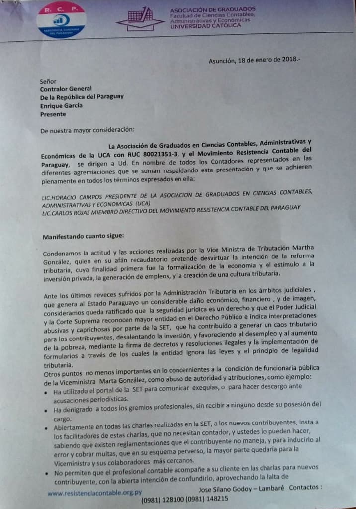 Entre otras cosas, los profesionales señalan lo siguiente: “Abiertamente en todas las charlas realizadas en la SET, a los nuevos contribuyentes, insta a los facilitadores de estas charlas, que no necesitan contador, y ustedes lo pueden hacer, sabiendo que existen reglamentaciones que el contribuyente no maneja, y para inducirlo al error y cobrar multas, que en su esquema perverso, la mayor parte quedaría para la Viceministra y sus colaboradores más cercanos”.