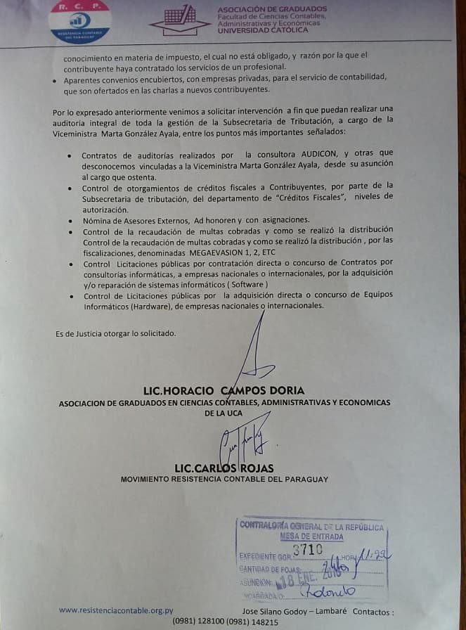 La Asociación de Graduados en Ciencias Contables, Administrativas y Económicas de la UCA,el Movimiento Resistencia Contable del Paraguay y la Lic. Alba Talavera presentaron una nota este jueves ante la CGR denunciando varios hechos presuntamente irregulares.