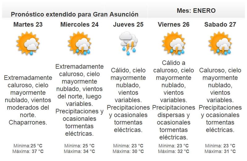 Según Meteorología, los pronósticos continúan indicando que durante la semana se mantiene alta la probabilidad que sigan las lluvias con tormentas eléctricas sobre varios puntos del país. A pesar de las precipitaciones; el ambiente se presentaría de cálido a caluroso y con alto contenido de humedad.