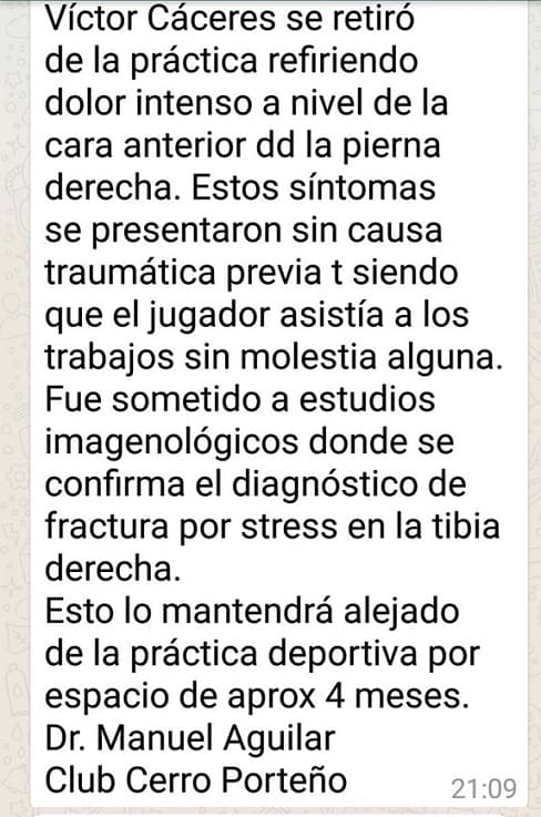 La noticia estalló este sábado y se confirmó en horas de la noche. El informe oficial del médico de Cerro Porteño señala que Víctor “Topo” Cáceres queda al margen de las canchas por al menos cuatro meses.
