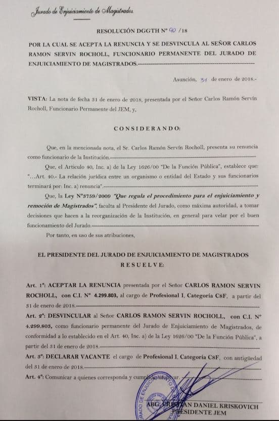 El JEM aceptó la renuncia, mediante la resolución N° 90/18, de Servín Rocholl y lo desvinculó de la institución según informó Última Hora.