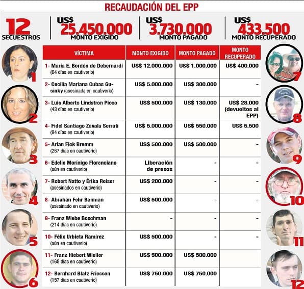 De los USD 25.450.000 que la banda armada exigió inicialmente a las familias de quienes tuvo en cautiverio, los criminales capitalizaron el 14% de dicho monto, ya que luego de bajar sus pretensiones en casi todos los hechos recibieron USD 3.730.000, señala el recuento de ABC Color, que se puede ver abajo: