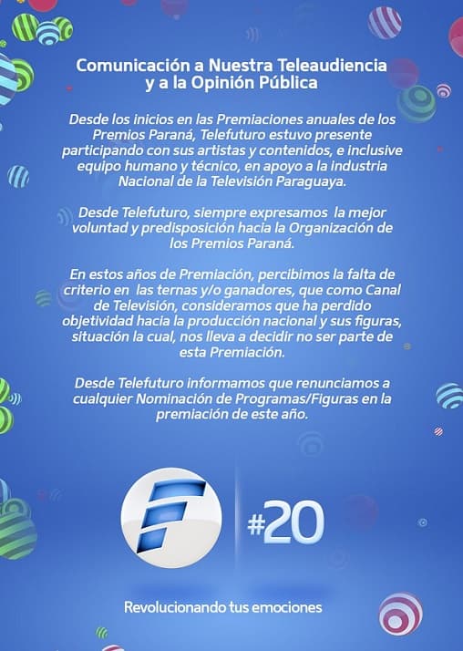 Ni bien se realizó el anuncio, los canales de televisión “Telefuturo” y “Latele” emitieron un comunicado institucional, renunciando a su participación en el evento, informa EPA.
