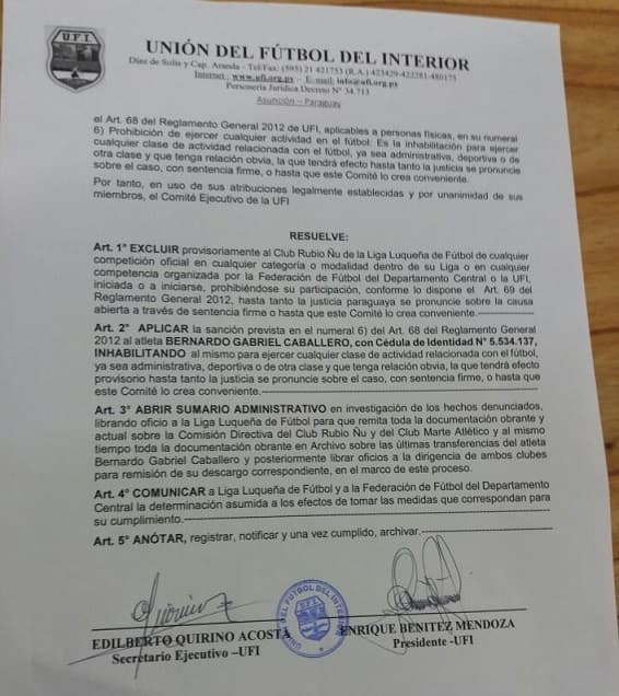Con la determinación, la entidad deportiva queda excluida “de cualquier competición oficial en cualquier categoría o modalidad dentro de la Liga o en cualquier competencia organizada por la Federación del Departamento Central o la UFI, iniciada o a iniciarse”.