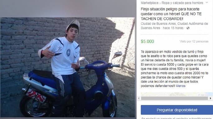 Los servicio varían dependiendo la situación de peligro. “Te aparezco en moto vestido de turró y finjo que te asalto o te robo para que quedes como un héroe delante de tu familia, novia o mujer! El servicio cuesta 5000 (pesos) y cada golpe en la cara que me des cuesta otros 500 y si querés pincharme la moto eso cuesta otros 2000 no te pierdas la chance de quedar como héroe! Y dale una lección al mundo de que todos podemos defendernos!!”, detalló.