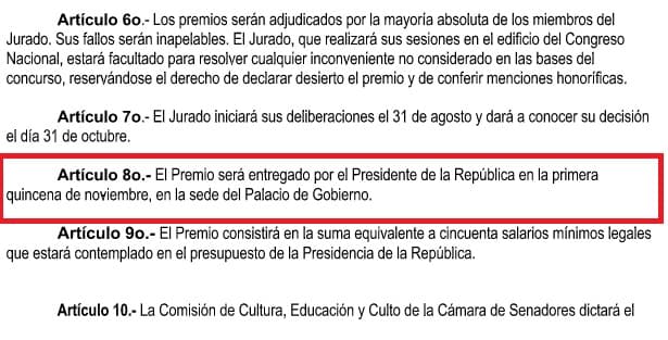 La ley 1149/97 establece cuestiones puntuales en el artículo 8 que dice lo siguiente: “El Premio será entregado por el Presidente de la República en la primera quincena de noviembre, en la sede del Palacio de Gobierno”.