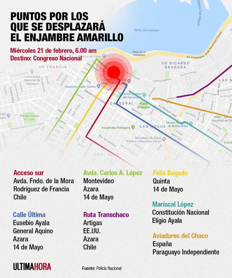 La marcha comenzará a las 6 horas del miércoles y ocupará avenidas como Eusebio Ayala, Aviadores del Chaco, Mariscal López, Acceso Sur, entre otras. Los detalles en la infografía de abajo: