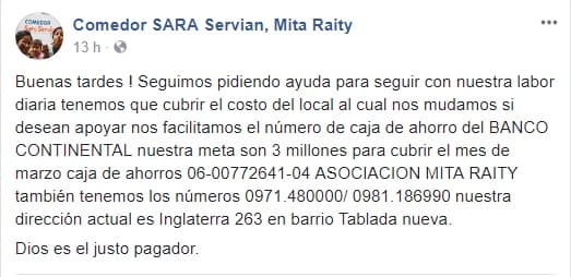 Los que deseen ayudar pueden hacerlo en la caja de ahorro del Banco Continental ahorros 06-00772641-04 Asociación Mita Raity, como también pueden comunicarse a los números (0971)480-000 o al (0981)186-990.