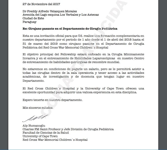 Explicó que luego de meses de completar test, formularios e intercambios de documentos traducidos, recibió la carta de admisión para realizar 1 año de formación complementaria en el área de Pediatría.