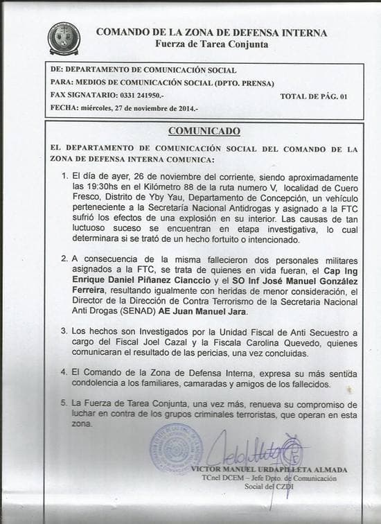 El 26 de noviembre de 2014 murieron en una explosión, en la zona de Cuero Fresco (Concepción) el capitán Enrique Daniel Piñánez y del suboficial José Manuel González. Fue testigo del hecho un agente de la Secretaría Nacional Antidrogas (Senad), Juan Manuel Jara y un cuarto hombre.